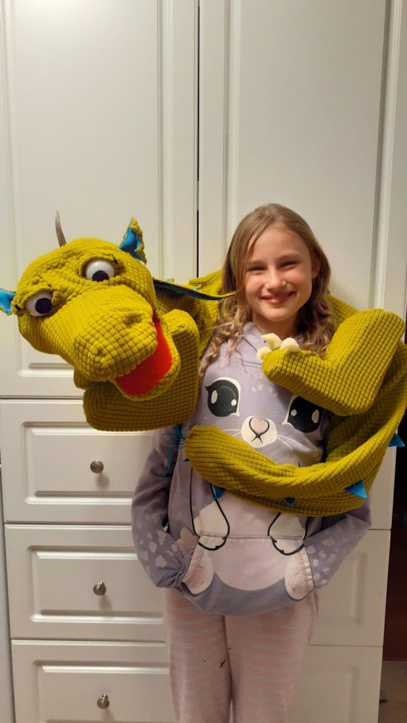 Jenna’s amazing Grade 6 teacher has encouraged her to use her puppets during these assignments. Jenna did her Passion Project on Puppetry, explaining the mechanisms used to create Janett, her dragon puppet.
