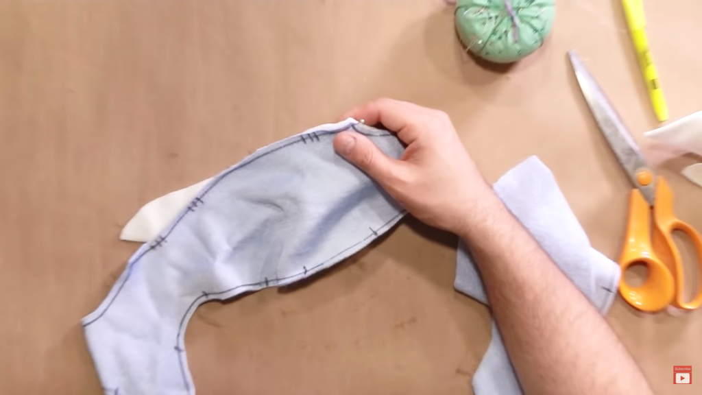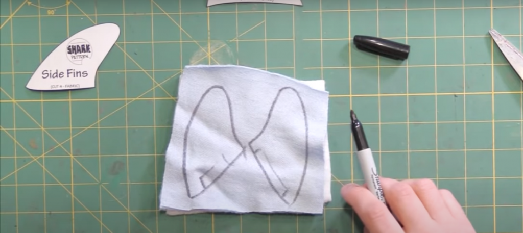 Take the fabric pattern for the side fins and trace it twice, making sure to flip the pattern on the second trace. Stitch along the edge of the fin, but leave the bottom open to insert the foam.