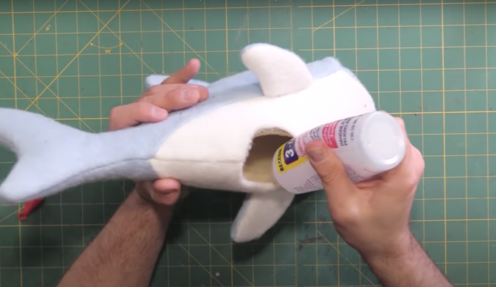 To put the fabric covering on the shark, start by applying contact cement to the edges of the fabric and plastic mouth. Allow to get tacky and then align the top notches and bottom notches. The rest of the fabric should line up as well and will need to be pressed a little bit to keep it in