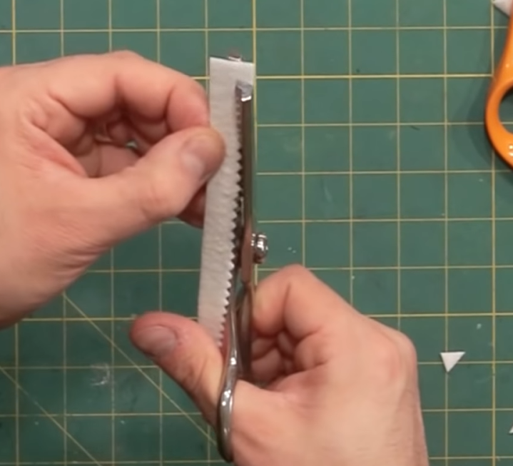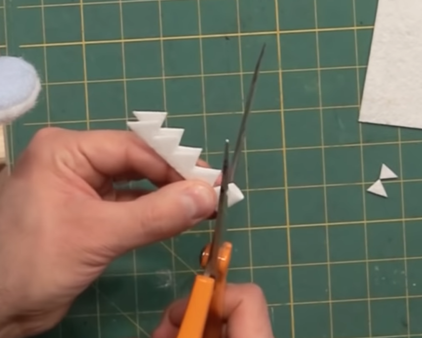 To make teeth, take a piece of stiffened felt and cut a small strip off. Little triangles can be cut by folding the strip in half and cutting small triangles into the felt. Pinking shears can also be used.
