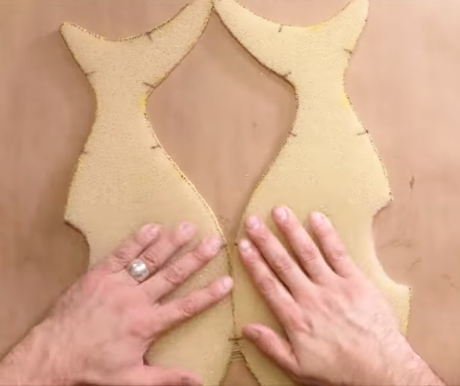 Place the foam pieces aside for now and work on the fabric coverings. To make the covering for the side fins, take scrap of fabrics used for the top and belly and place them right-sides together.