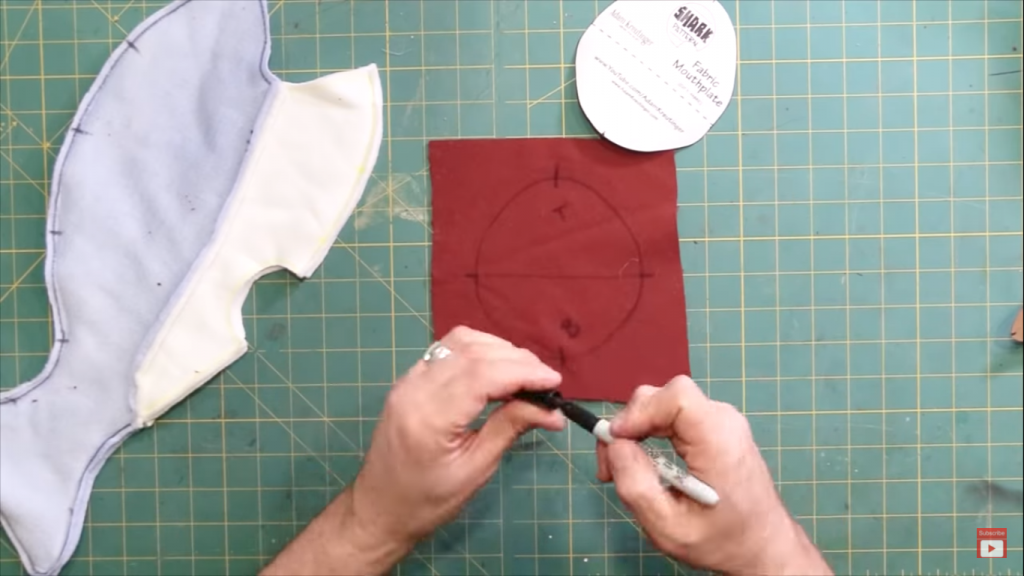 Cut the mouth-plate out of the fabric and pin into place on the shark. If using a sewing machine add a half inch seam allowance.